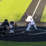 - Grant Watkins, senior infielder from Los Alamos, New Mexico, swings a strike. (Photo by Callie Brimberry)