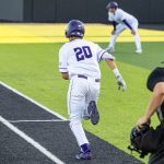 - Gavin Brzozowski, graduate outfielder from Mansfield, sprints to first base. (Photo by Callie Brimberry)