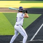 - Nick Arias, senior infielder from Tucson, Arizona, mentally prepares to bat by taking practice swings. (Photo by Callie Brimberry)