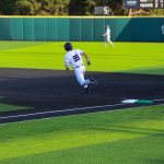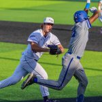 - Grant Watkins, senior infielder from Los Alamos, New Mexico, records an out at first base. (Photo by Daniel Rhodes)
