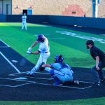 - Grant Watkins, senior infielder from Los Alamos, New Mexico, swings and makes contact with the ball. (Photo by Daniel Rhodes)