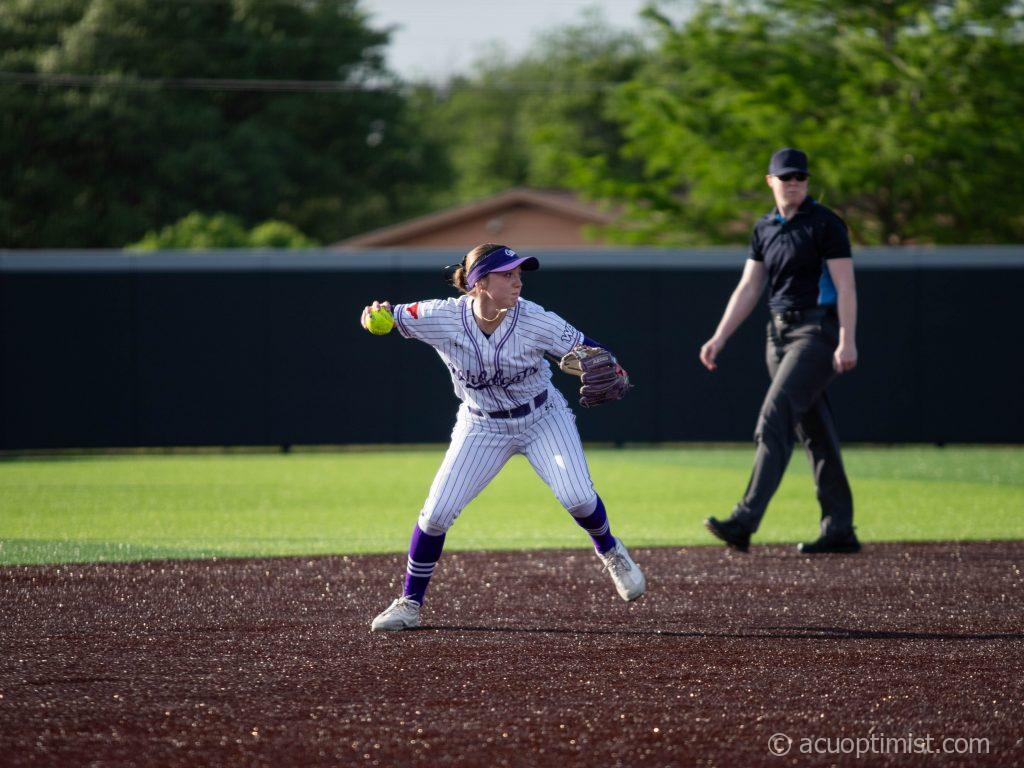 April 16, 2026 by Naya Pacheco Leave a Comment Audrey Lacina, redshirt sophomore from Bentonville, Arkansas, throws to first for an out. (Photo by Naya Pacheco)