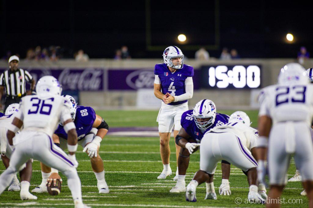 Stone Earle, redshirt senior quarterback from Fort Worth, prepares for the drive before the ball is snapped. (Photo by Ashley Henderson)