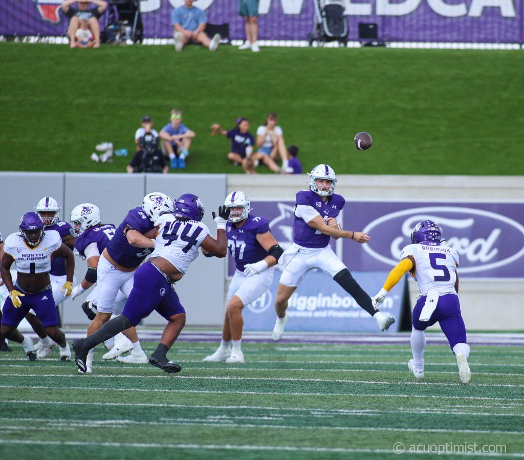 October 4, 2025 by Ashley Henderson Leave a Comment Stone Earle, redshirt senior quarterback from Fort Worth, throws the ball during a drive. (Photo by Ashley Henderson) Football V Northern Alabama
