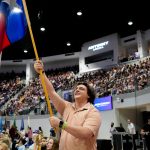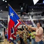 - Sawyer Davis, junior journalism major from Denver City, carries the Texas flag in the Parade of Flags. (Photo by Daniel Curd)