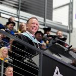- Dr. Phil Schubert, president of the university, smiles at the crowd. (Photo by Daniel Curd)