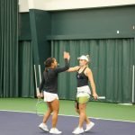 - Maryjoe Crisologo, senior from Surrey, British Columbia, gives duo partner Libby Blair, freshman from Salem, Oregon, a high five. (Photo by Hannah Park)