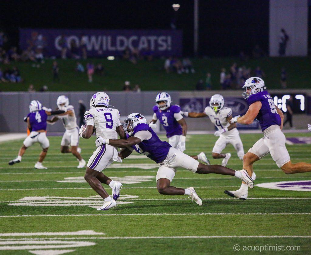 September 8, 2025 by Ashley Henderson Leave a Comment Jordan Mukes, redshirt senior defensive back from Choctaw, Oklahoma, tackles an SFA player. (Photo by Ashley Henderson) Football vs SFA 09-06-2025